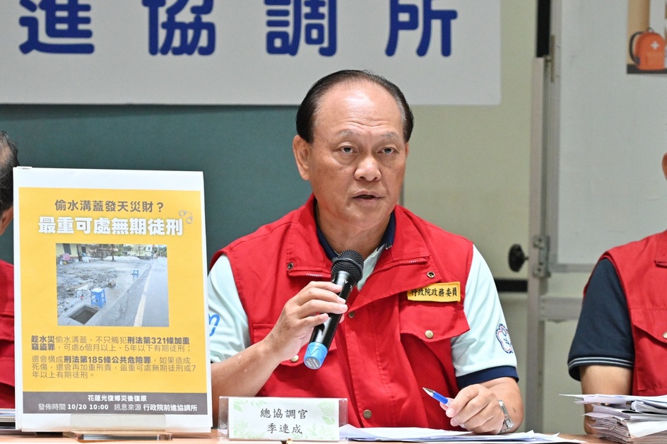 發災難財?花蓮縣光復鄉上個月因馬太鞍溪堰塞湖溢流重創,目前40公里側溝已完成清淤,卻出現多個溝蓋板遺失情形,中央前進協調所總協調官季連成今(20)日譴責,若造成人員死傷,最重可處無期徒刑。