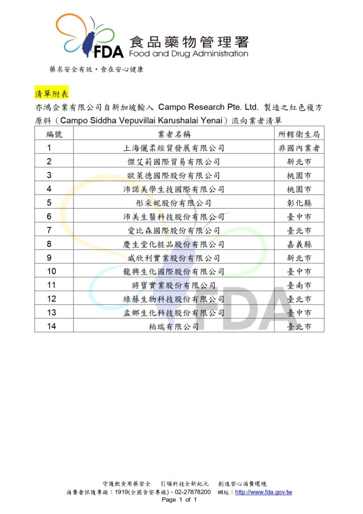 食藥署副署長王德元表示,10月底食藥署在外部通報系統看到中國製化妝品檢出蘇丹紅,懷疑與新加坡CampoResearch(CampoCosmetics)公司生產的原料有關,因此啟動清查。透過登錄系統比對後,未發現有中國化妝品以正式報關方式輸入台灣,但因網路平台販售商品眾多,食藥署改以圖片比對方式搜尋,發現市面上有人販售疑似同款產品。