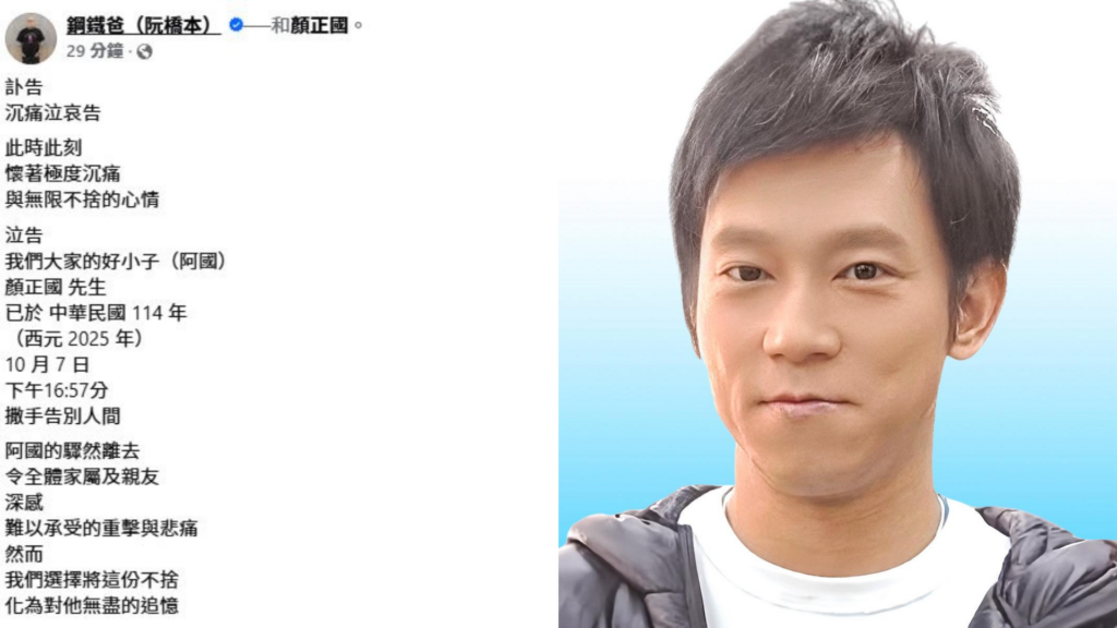 鋼鐵爸今天在臉書發文表示,「顏正國於中華民國114 年10月7日下午16時57分撒手告別人間,阿國的驟然離去,令全體家屬及親友深感難以承受的重擊與悲痛,然而我們選擇將這份不捨化為對他無盡的追憶」。鋼鐵爸也提到,對於顏正國離世感到萬般不捨,「但我們深知他已揮別生生,至另一個美好的世界,生命是個圓,我們終將再見。」