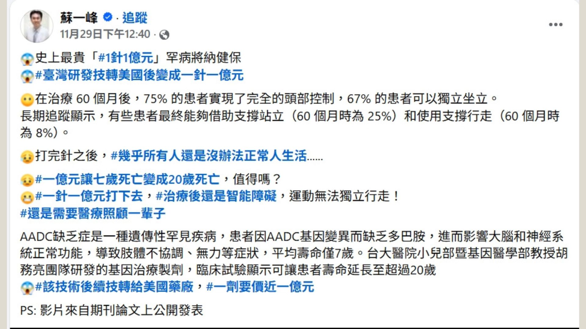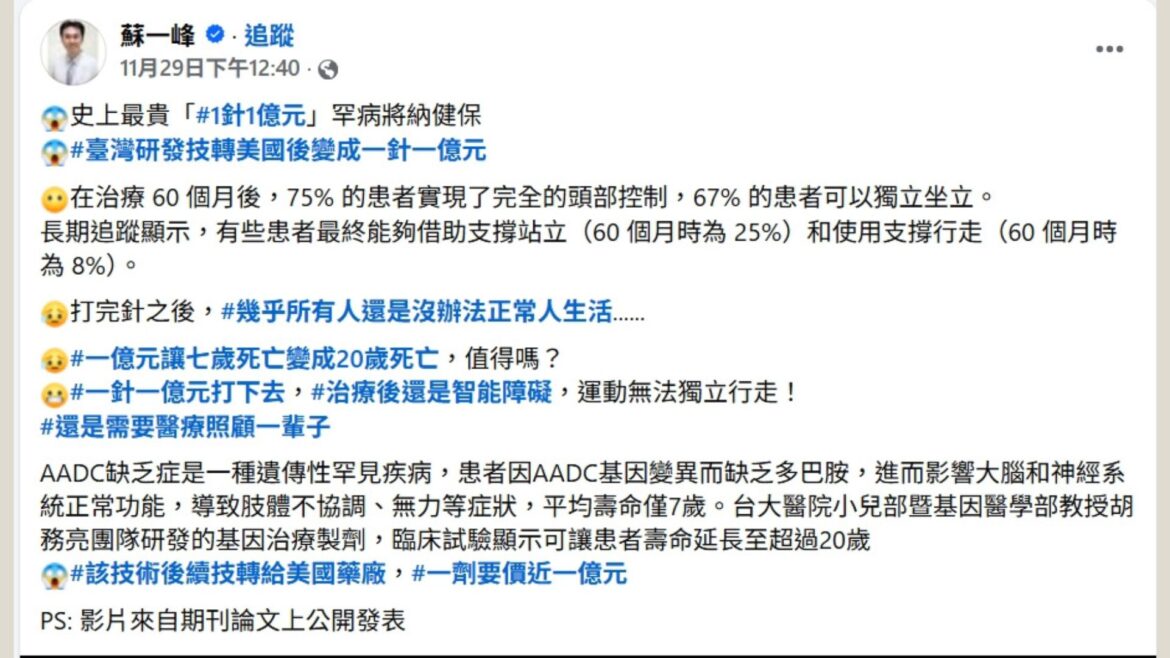 近日健保署通過給付AADC缺乏症(芳香族L-胺基酸類脫羧基酶缺乏症)的一劑一億元的基因治療藥物,遭網紅醫師蘇一峰在社群媒體上以成本效益為由抨擊「一年13人打就是每個人拿65元,一家四口要付260元」,「最重要的沒說,研究顯示病童打完幾乎還是運動障礙,九成無法獨立行走,而且都還有智能發展障礙!一針一億元只為了讓7歲能活到20歲以上!」