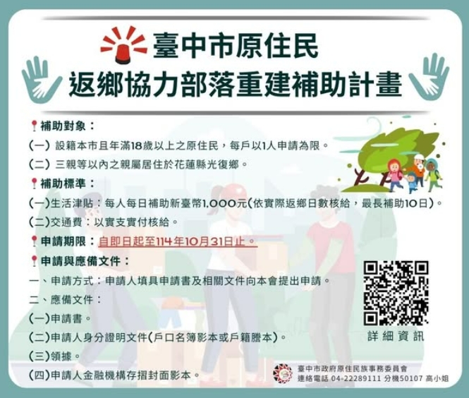 花蓮縣馬太鞍溪堰塞湖因壩頂溢流,重創光復鄉,考量許多外地原住民遊子,心繫家園渴望返鄉協助災後重建,台中市創全國之先,提供在台中的原住民返鄉重建津貼,每戶最高1萬元外,交通費實支實付核給。