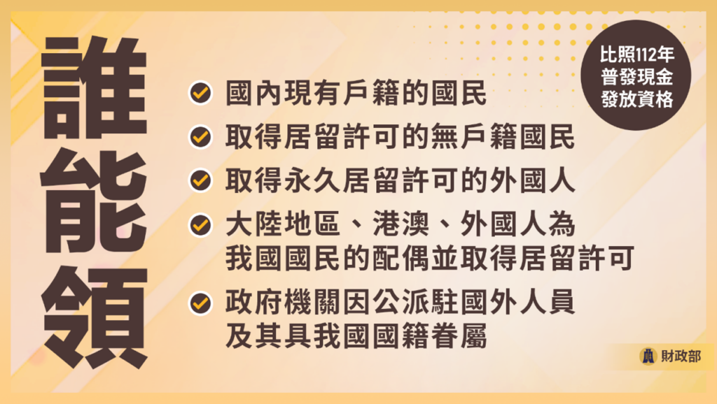 財政部表示,此次普發現金1萬元原則比照2023年普發現金6000元方式辦理,時程會從特別預算公布後,一個月內開始執行發放作業,並且於7個月內發放完畢。以下整理領取資格與領取方式。