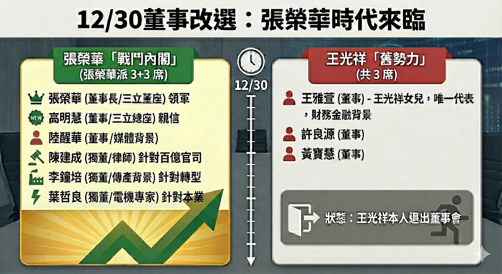 反觀,張榮華將全面主導董事會。名單由張榮華親自領軍,並首度將三立集團總經理高明慧納入董事會,兩位三立現職高層的直接坐鎮,象徵張榮華將從過去的幕後共治,轉為第一線的實質「親政」,加上陸醒華及三名獨董,張榮華已確保在未來董事會中擁有絕對話語權。