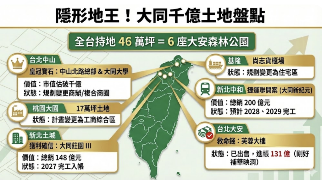 根據最新資料盤點,大同集團在全台持有的土地面積超過46萬坪,換算下來相當於6座大安森林公園的大小,若以目前的市場行情估算,這些土地的總潛在價值高達3,000億元。