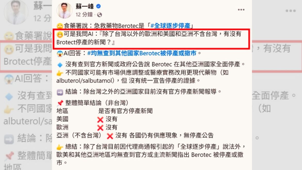 網紅醫師蘇一峰今(24)日於社群平台發文,指稱德國原廠氣喘急救藥物「Berodual®備喘全」和「Berotec®備勞喘」因台灣藥價過低不敷成本,即將退出台灣市場,並以此諷刺「台灣任性醫療」導致病人自求多福。此言論隨即引發醫藥界議論,然而原廠藥廠與食藥署迅速出面說明,澄清該藥品退出是基於「全球市場策略」與「逐步停產」,並非針對台灣。