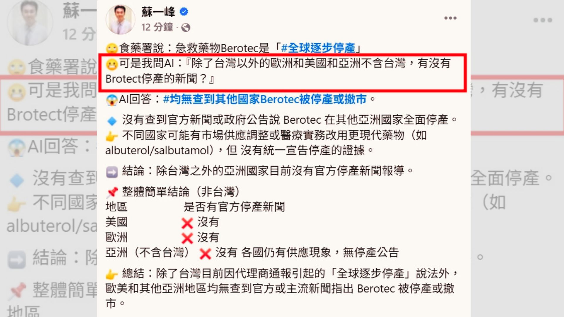 面對藥廠與官方的澄清,蘇一峰並未道歉,反而再次發文自曝透過AI工具查詢,宣稱在歐美及亞洲其他國家均查無官方停產新聞,並據此推論「只有台灣買不到藥」。他以此AI搜尋結果質疑政府說謊,引發網友留言批評其「專業醫師怎麼會問AI?」。
