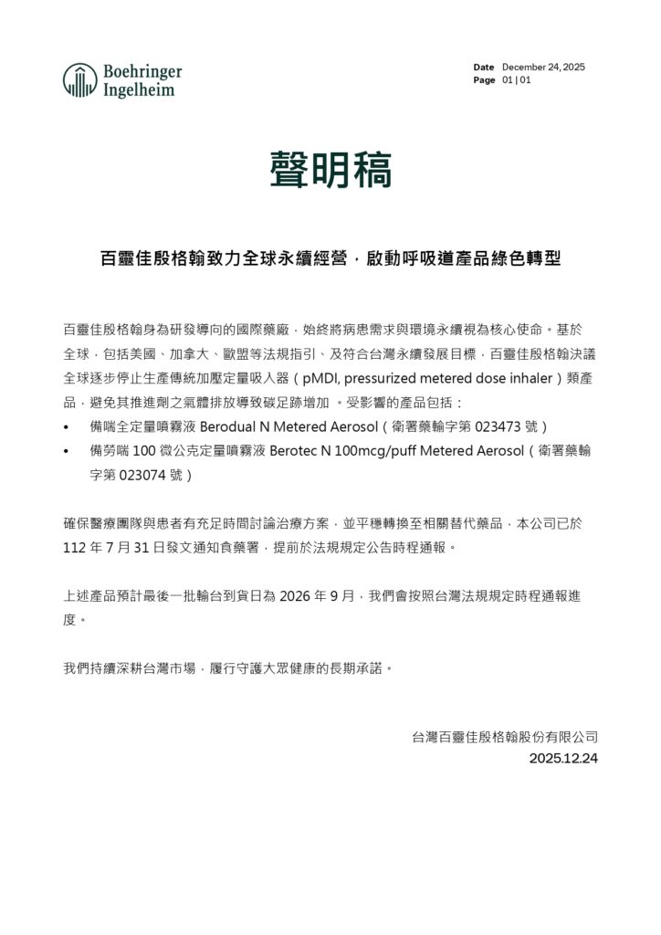 台灣百靈佳殷格翰(BoehringerIngelheim)發布正式聲明表示,受影響的藥品是配合總公司全球策略調整,因應環境永續等因素正於「全球範圍內逐步停產」。藥廠強調,為了確保醫療團隊與患者有充足時間轉換替代藥品,早在2023年7月便已主動通報食藥署,並將維持供貨直至2026年9月。這意味著臨床端有長達三年的緩衝期,與蘇一峰所言的藥品退出緊迫感有顯著出入。