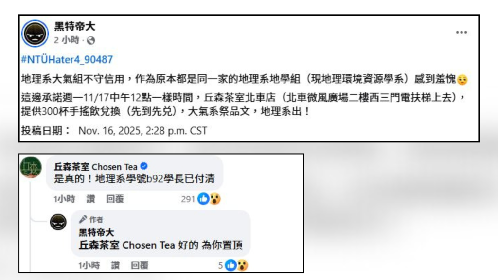 一名自稱「台大大氣系」的網友颱風假預測失準,今天承諾要發放的300份雞排、100杯珍奶,但時間到了卻未見本人現身,現場等待約400人全被放鳥。黑特帝大粉專今天下午又出現一篇文,自稱「地理系」的貼文指稱,看到大氣系學生跳票感到羞愧,決定明天中午在丘森茶室北車店加碼發放300杯飲料,先到者可先兌換,手搖飲店家亦在貼文下方留言證實:「是真的!地理系學長已付清。」