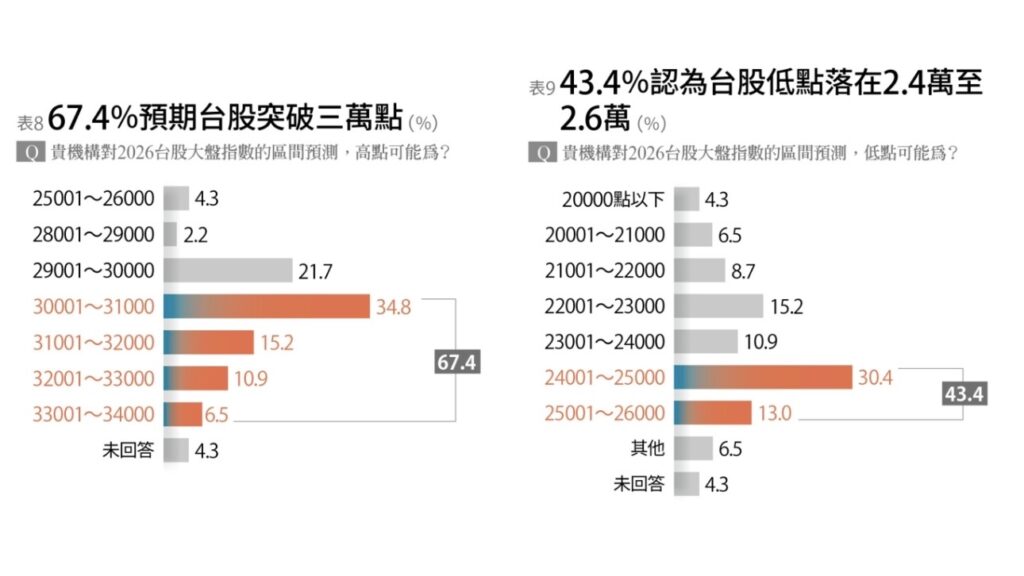 談到2026年台股走勢,國內金融業者有67.4%預期會突破3萬點,最集中的預測區間落在30001至31000點,占比高達34.8%,更有17.4%預測飆破32000點,反映出台灣在AI浪潮中,憑藉科技與半導體的獨特優勢,讓台股保持穩健信心。