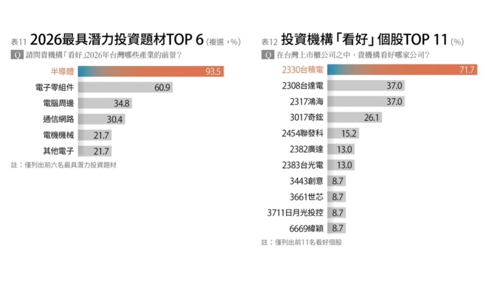 這份調查來自《遠見》從10月27日至11月10日展開的「2026投資趨勢大調查」,針對金控、銀行、投信投顧、證券與期貨等專業投資機構進行,共回收46份有效問卷。
