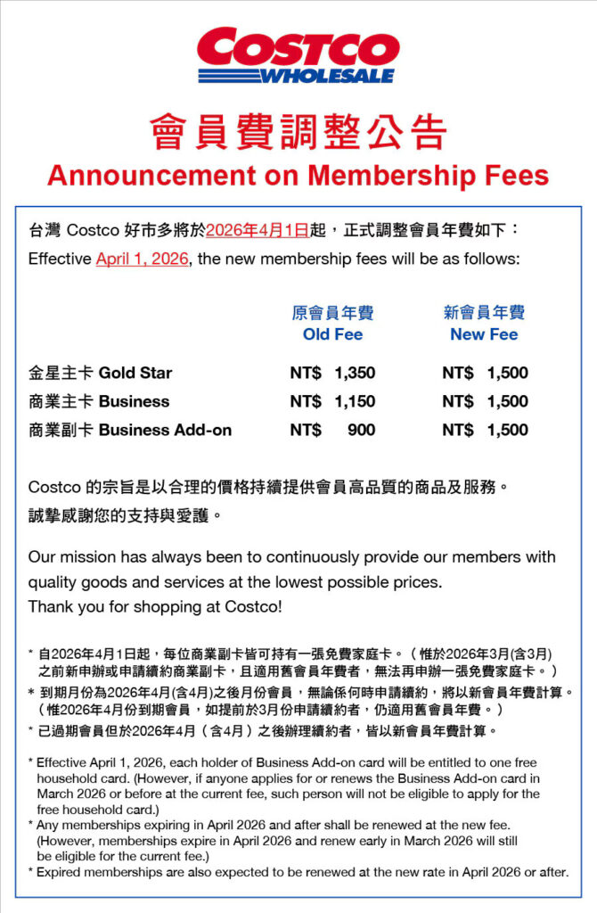 要漲價了!好市多(Costco)公告將調整會員年費,自4月1日起,一般金星會員年費將由1350元調漲至1500元,調幅150元,漲幅11%;商業主卡年費由1150元調升至1500元,漲幅30%,商業副卡則由900元一口氣調升至1,500元,漲幅66%。