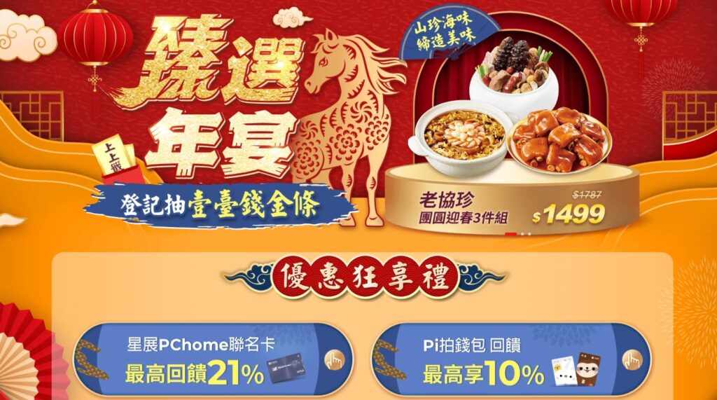 為了拉抬買氣,PChome用「抽黃金」把注意力拉滿:即日起至1月31日,食品指定商品單筆滿99元登記抽市價25,800元「煌隆壹台錢黃金條塊」(約2.6萬元),單筆滿2,888元登記送500 P幣;年菜本身則主打精選85折起。
