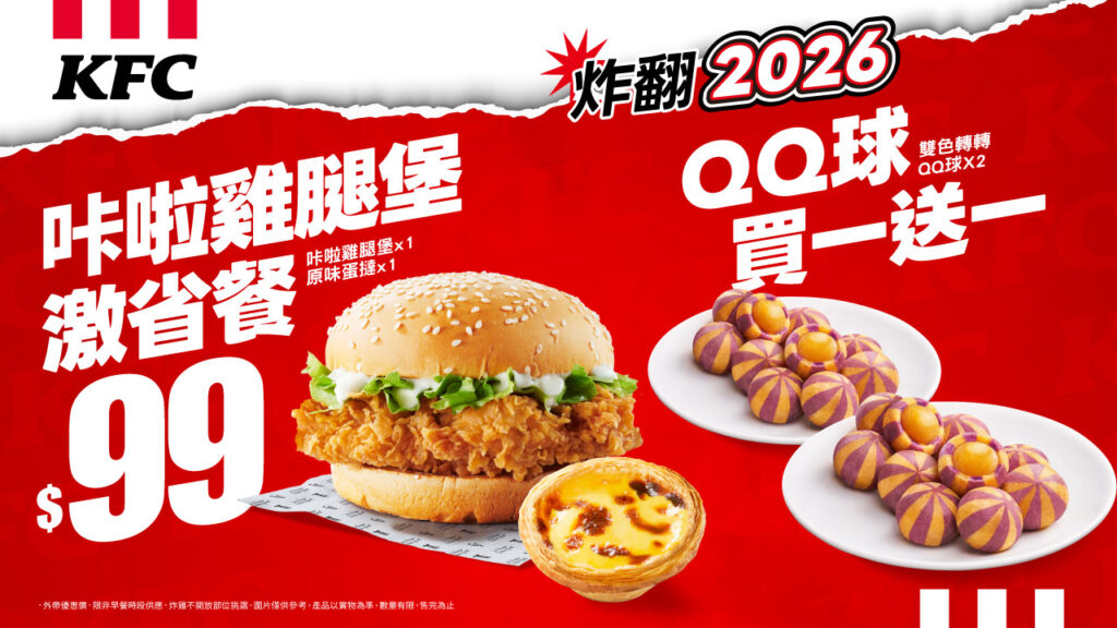 最後則是年節限定「炸翻2026」優惠(即日起至2月2日),包含4塊上校雞塊、雙色轉轉QQ球、香酥脆薯、經典冰奶茶等點心買一送一;99元激省個人餐:咔啦脆雞、咔啦雞腿堡等主食套餐百元有找,最低52折起。以及299元歡聚桶:內含6塊咔啦脆雞與2顆新品蛋撻,現省225元。