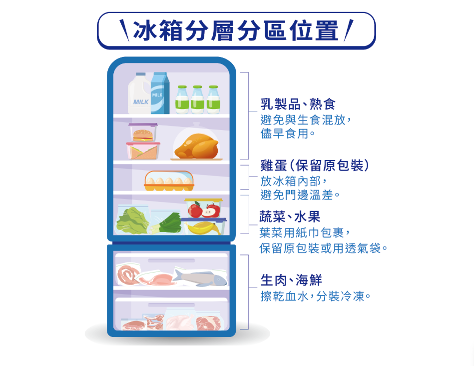 - 乳製品與熟食:建議放在冷藏室上層並儘早食用,避免與生食混放。