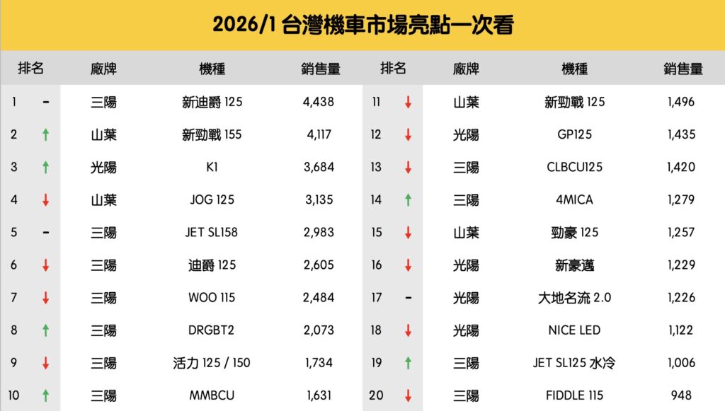 綜觀2026年1月的市場表現,我們可以看出單月5.7萬輛的規模遠超過2025年同期,證明了國內機車市場的剛性需求依然旺盛,且消費者對於改款與高CP值的車款買單意願極高,而YAMAHA山葉的強勢回歸改變了市場結構,成功將市場拉回三強鼎立的局面,這對於消費者而言絕對是利多,因為激烈的競爭勢必帶來更優惠的價格與更好的產品。
