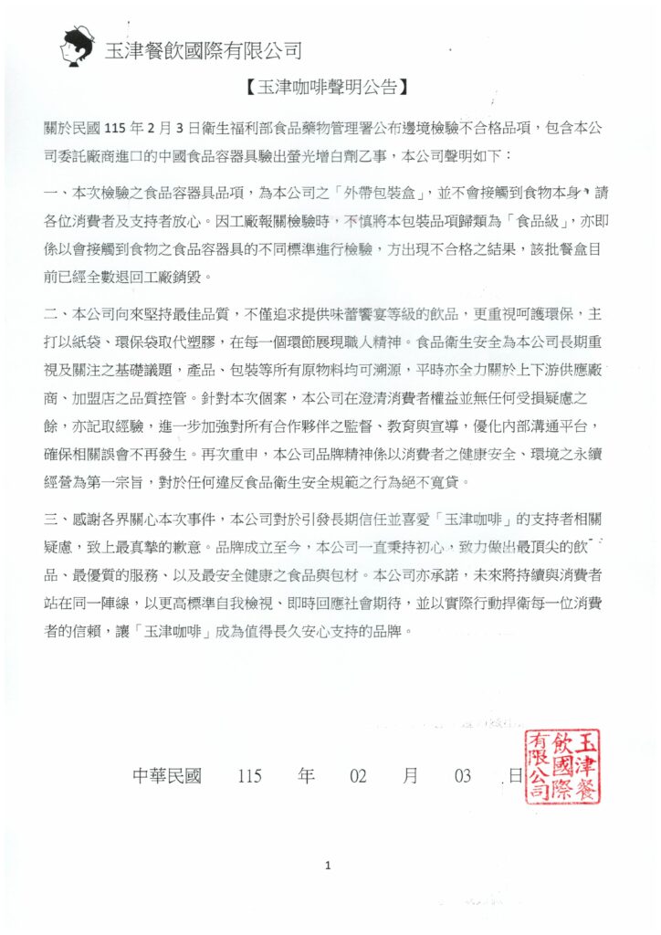 針對包裝容器具違規,玉津餐飲國際有限公司於今日發表三點聲明向社會大眾致歉。玉津解釋,本次檢驗不合格的品項為公司的「外帶包裝盒」,設計上並不會直接接觸食物本身。