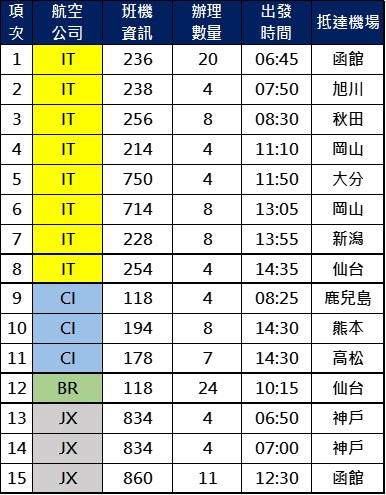 - 適用航空:中華航空、長榮航空、星宇航空、台灣虎航共計122架航班。