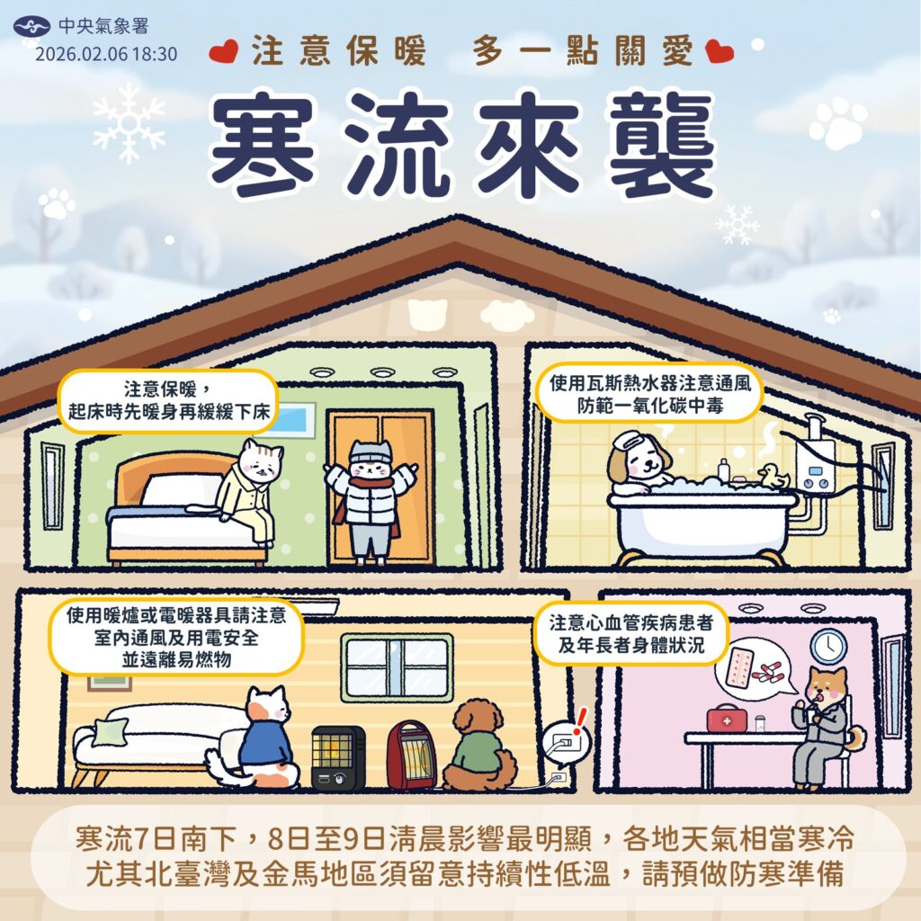 氣象署也透過臉書專頁提醒「居家保暖安全守則」,使用瓦斯熱水器務必保持通風,避免一氧化碳中毒;起床時應採「緩」字訣,先在被窩暖身再起身,以防溫差過大造成心血管不適。
