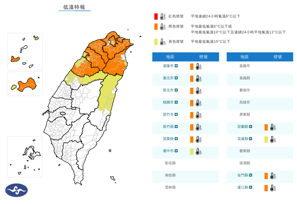 台中以北、宜花、外島地區共12縣市發布低溫特報。(圖/中央氣象署提供)
