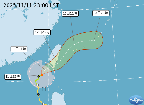 根據中央氣象署,12日0時中心位置在鵝鑾鼻西南方約210公里處,每小時8轉19公里速度,向東北轉東北東進行,中心氣壓985百帕,近中心最大風速每秒25公尺,瞬間最大陣風每秒33公尺,七級風暴風半徑200公里。