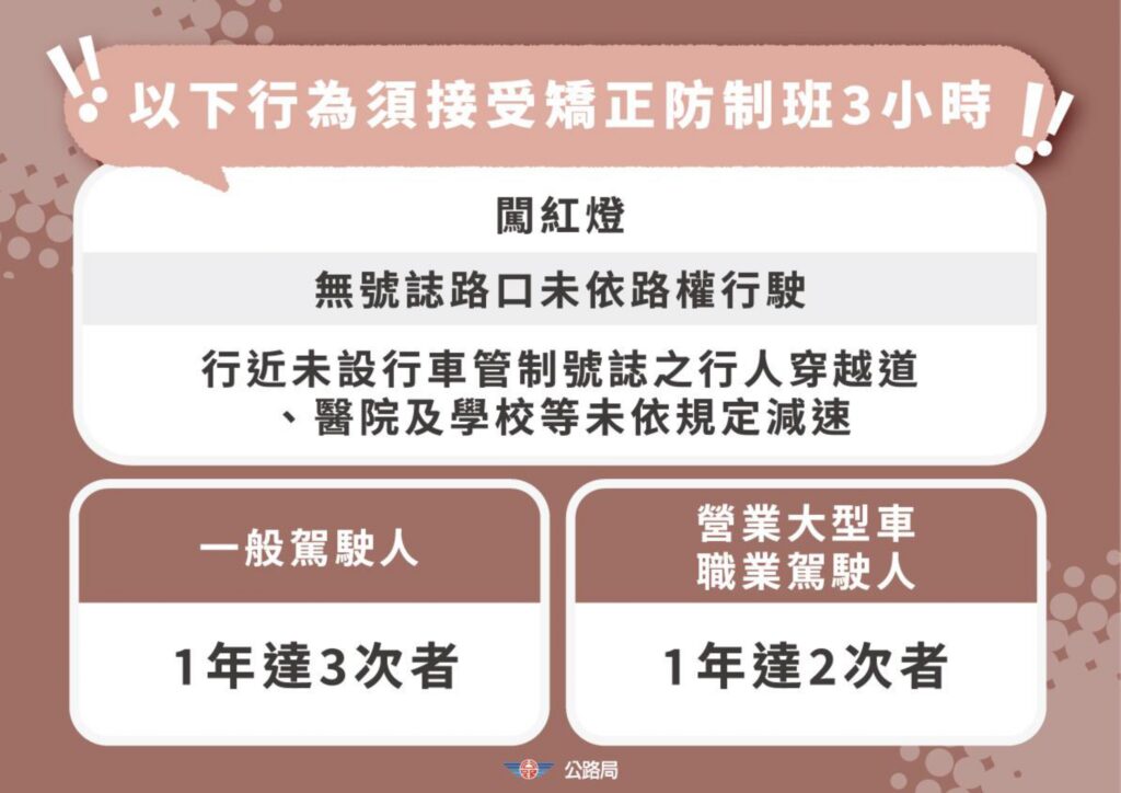 在「矯正防制班講習」方面,公路局針對A1(造成人員當場或24小時內死亡)交通事故十大肇因分析,選定闖紅燈、未依規定減速及無號誌路口未依路權行駛,此3大違規累犯,將要求須參加矯正防制班的交通安全講習。