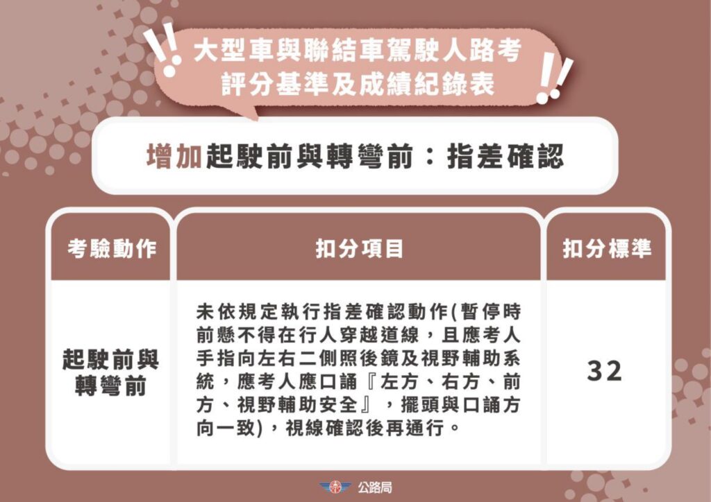 大型車方面,則需在起駛及轉彎前執行只差確認動作(暫停時前懸不得在行人穿越道線,且應考人手指向左右二側照後鏡及視野輔助系統,應考人應口誦『左方、右方、前方、視野輔助安全』,擺頭與口誦方向一致),視線確認後再通行,未完成會扣32分。