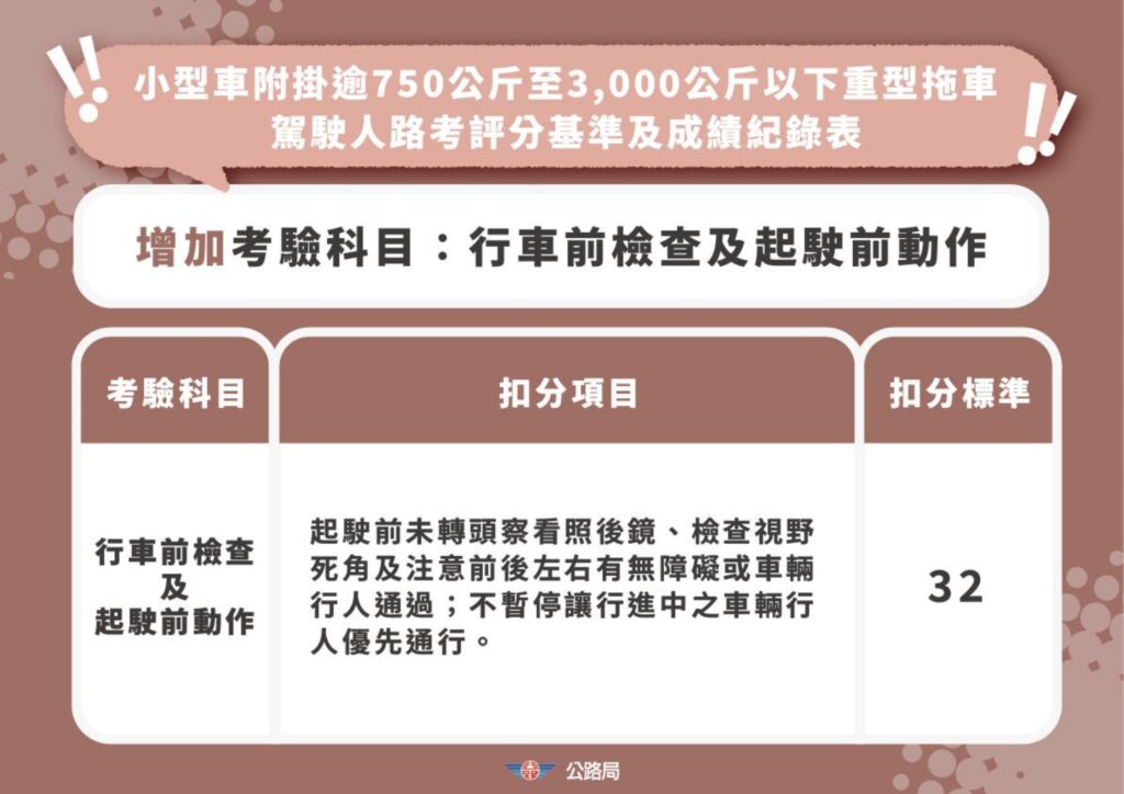 公路局提醒,考試日期在115年3月31日(含)以後者,將適用新評分基準與成績紀錄表;3月30日(含)以前考試者,則仍適用舊制。