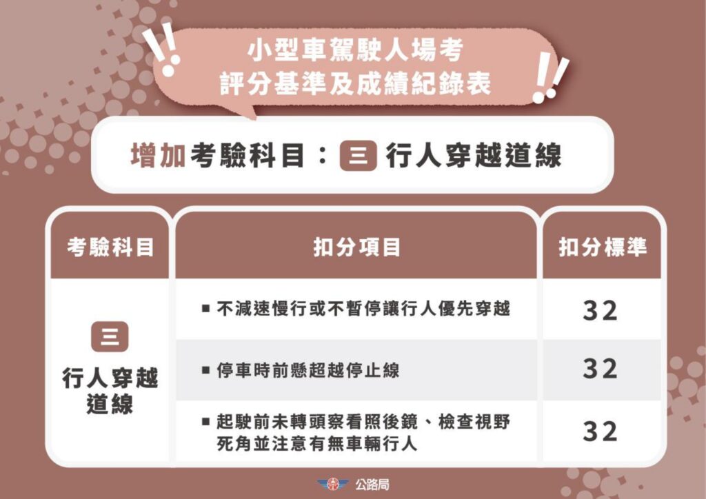 小型車考照新增,行經行人穿越道時減速停讓行人優先穿越(停車時前懸不能超越停止線),及起駛前須轉頭察看照後鏡和檢查視野死角,以上未依規定者每一項扣32分,直接不及格。