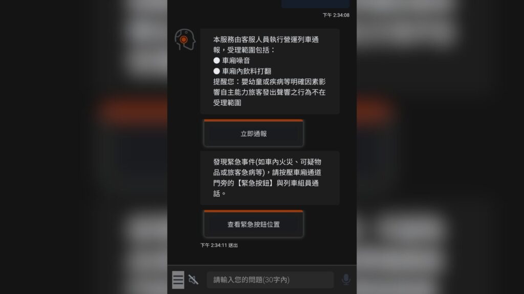 此外,若遇到緊急事件,如車內火災、發現可疑物品或旅客突發疾病等情況,仍應優先使用每節車廂前後通道門旁的旅客緊急對講機(紅色緊急按鈕),直接與列車組員通話,以利第一時間獲得即時協助。