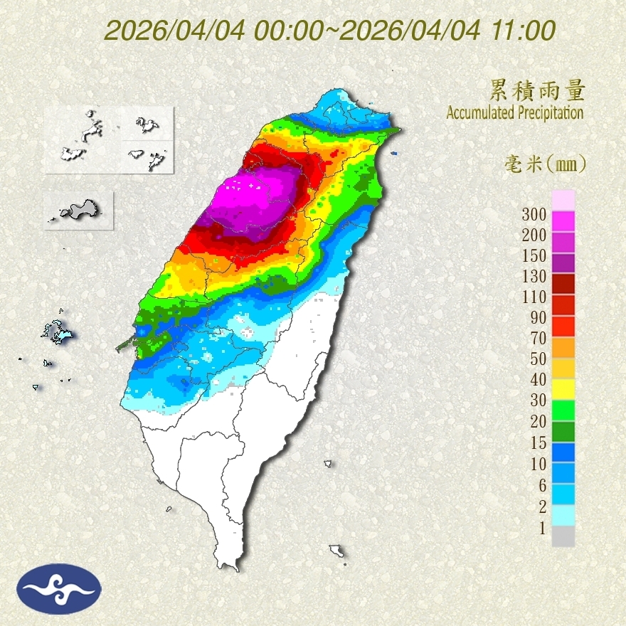 鋒面影響持續,今(4)日清晨起出現劇烈降雨,其中苗栗縣達大豪雨等級,新竹、台中等縣市也達到豪雨等級。苗栗局部地區累積雨量超過300毫米,水利署也針對部分鄉鎮發布淹水警戒,提醒民眾提高警覺。