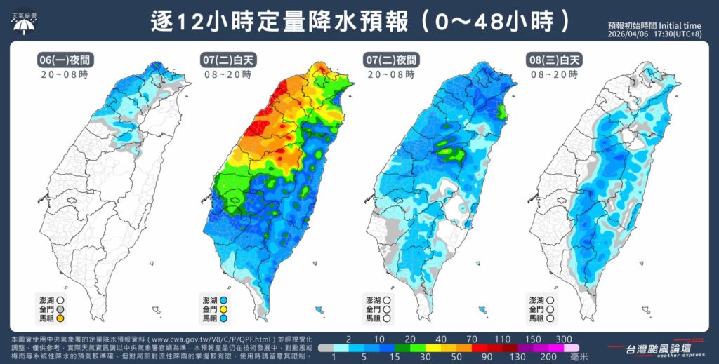 根據氣象粉專「台灣颱風論壇|天氣特急」預報,今日鋒面通過期間,彰化以北及金門、馬祖地區降雨最為明顯,雷雨帶發展旺盛時,易出現強降雨與瞬間劇烈天氣。