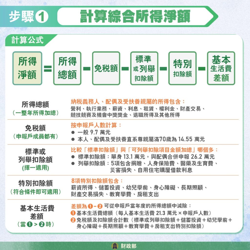 基本生活費差額:其計算方式如下,當「基本生活費總額(每人基本生活費21.3萬元 × 申報戶人數)」超過依規定可減除的「免稅額及扣除額合計數(標準或列舉扣除額+儲蓄投資+幼兒學前+身心障礙+長期照顧+教育學費+房租支出特別扣除額)」,差額可從申報戶當年度的所得總額中減除。