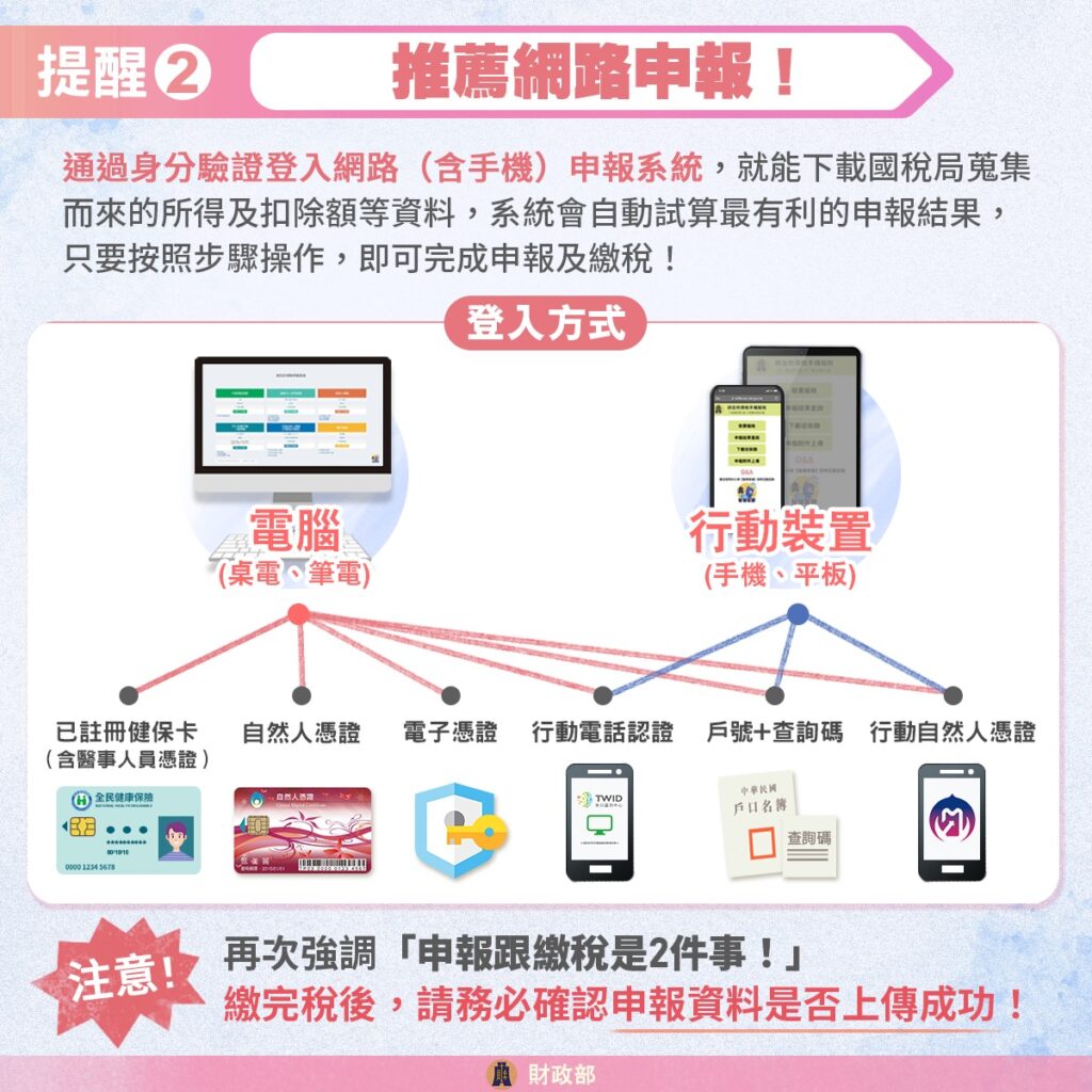 若要用手機、平板進行登入,可使用行動電話認證、戶號與查詢碼、行動自然人憑證。繳完稅後,請務必確認申報資料是否上傳成功。