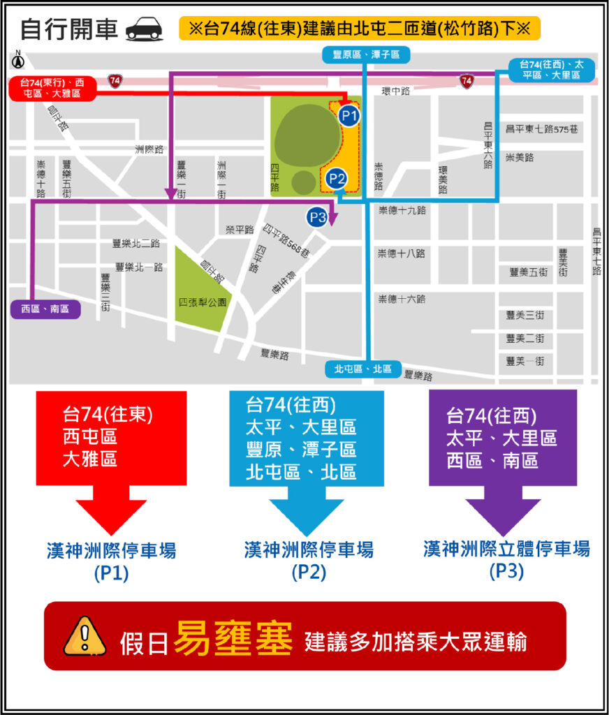 - 漢神洲際停車場(P3):從台74(往西)、太平區、大里區、西區、南區開車前往的民眾,建議停放在P2停車場。