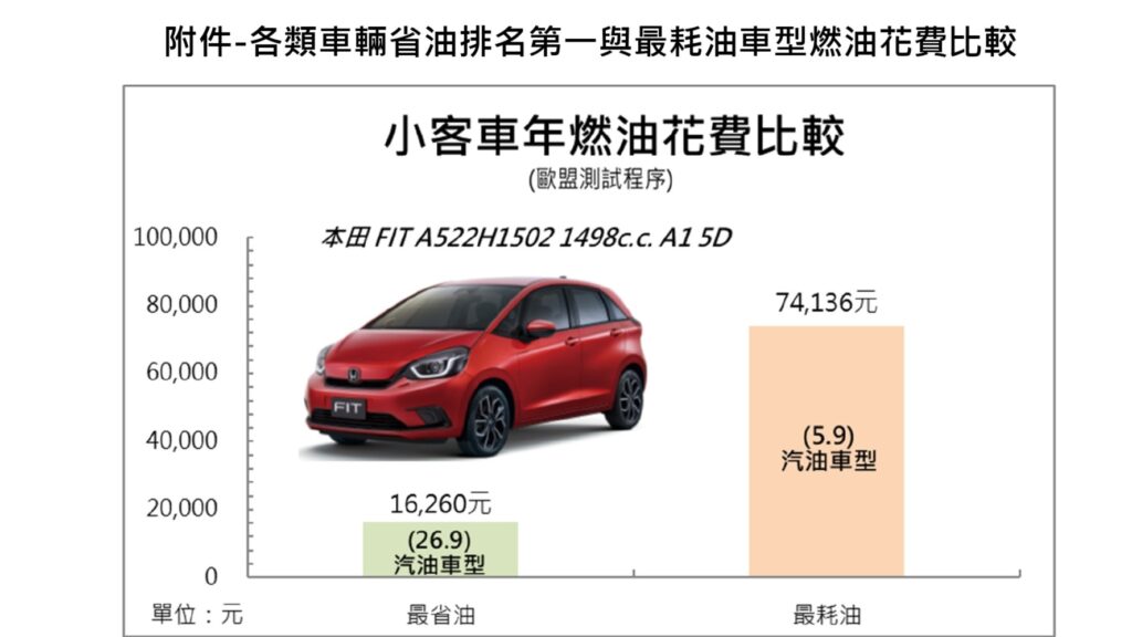 在非電動車款節能表現中,小客車由本田(Honda)A522H1502 1498c.c. A1 5D油電複合動力汽油小客車表現最佳,每公升汽油平均可行駛26.9公里。假設一年行駛1.5萬公里、油價以每公升29.16元估算,一年燃油費約1萬6260元,與最耗油車款一年燃油費約7萬4136元相比,相差約4.5倍、超過5萬7千元。