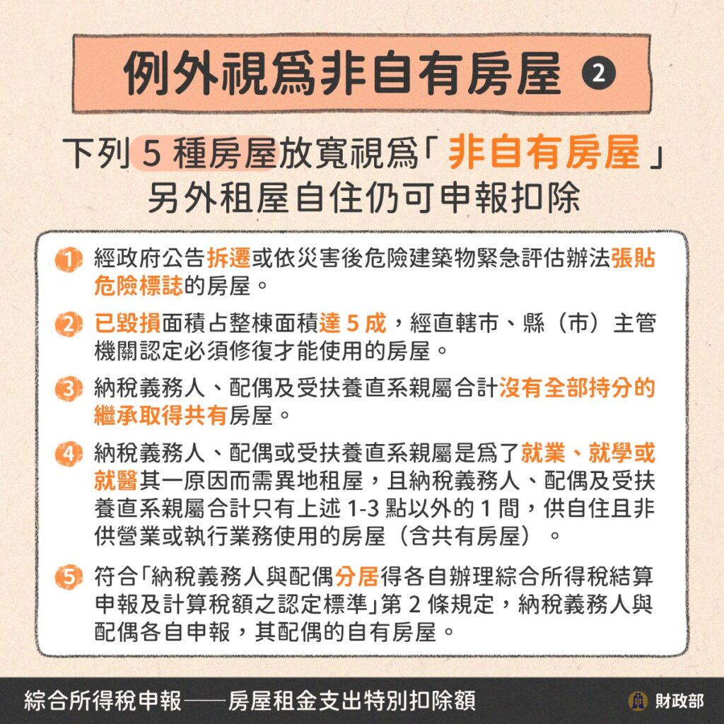 - 納稅義務人、配偶及受扶養直系親屬是為了就業、就學或就醫其一原因而需異地租屋,且納稅義務人、配偶及受扶養直系親屬合計只有上述1至3點以外的1間,供自住且非營業或執行業務使用的房屋(含共有房屋)