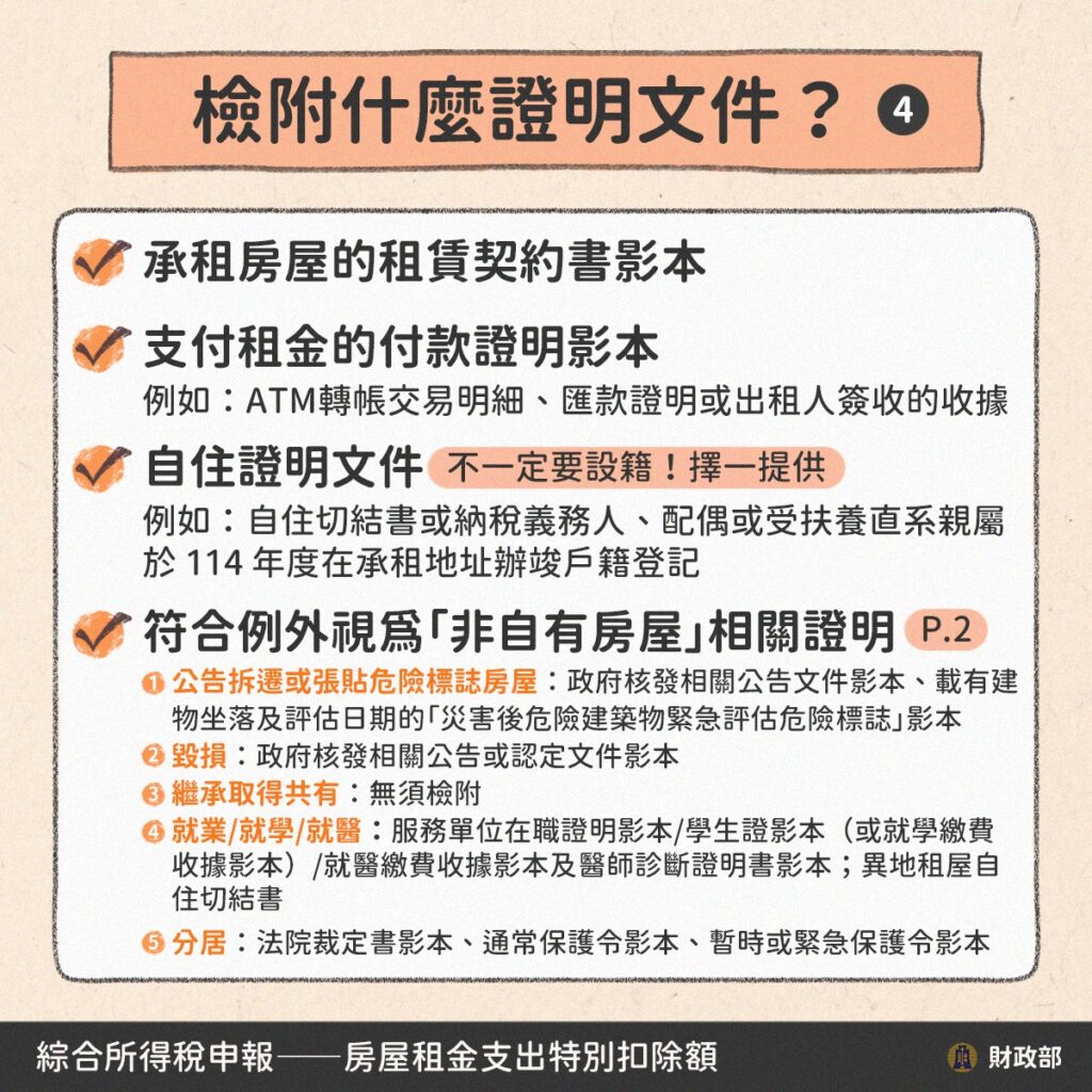 - 租賃契約書:需附上申報年度(114年1月1日至114年12月31日)內的所有租約影本,若有換約或搬家產生多份契約,需全數附上。