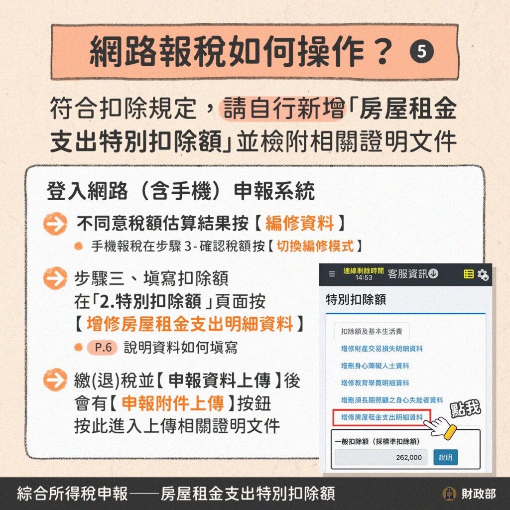 使用網路系統(含手機)報稅相當便捷,登入後在系統左側欄位找到「特別扣除額」,接著點選「增修房屋租金支出明細資料」。