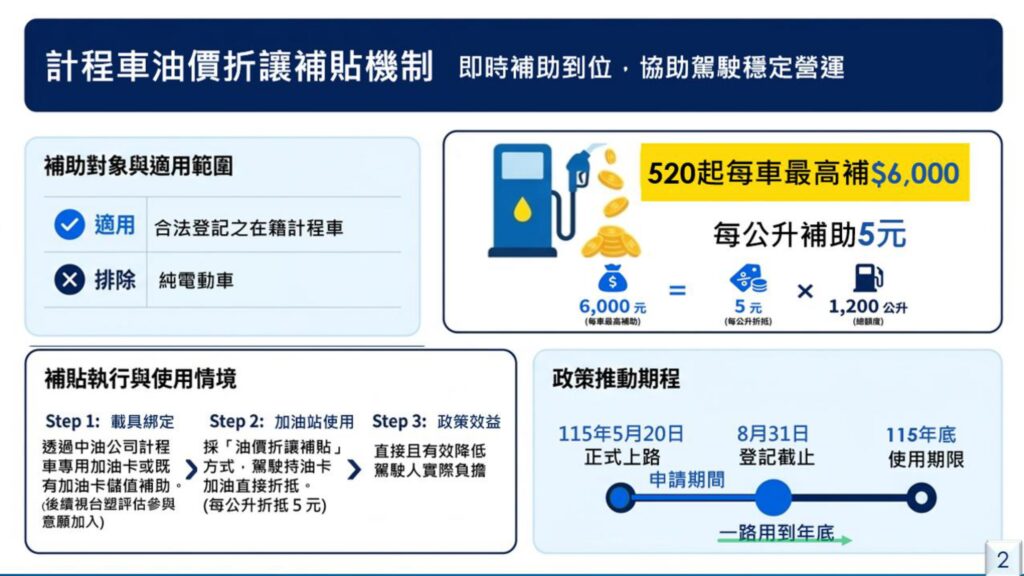 交通部指出,隨著油價上漲,計程車與大眾運輸業者首當其衝,對油價變動高度敏感,因此在「民生安定」與「即時協助」兩大原則下推出補貼政策。首波以中油公司為合作對象,針對全台約9萬輛在籍計程車(不含純電車),提供每公升折抵5元、每車最高6千元的油價補助。該方案預計自115年5月20日正式上路,使用期限至115年底,駕駛人須於8月31日前完成申請。