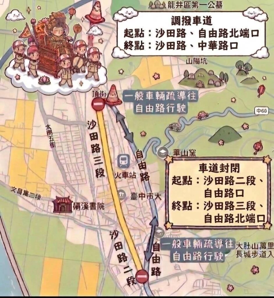 此次交通管制重點集中在大肚與龍井區主要幹道,尤其是沙田路沿線。警方規劃三大彈性車道調撥路段,涵蓋沙田路一段至六段,並視車流狀況即時調整通行方向。同時,部分路段將實施區段性改道,引導車輛改行自由路與中華路分流。