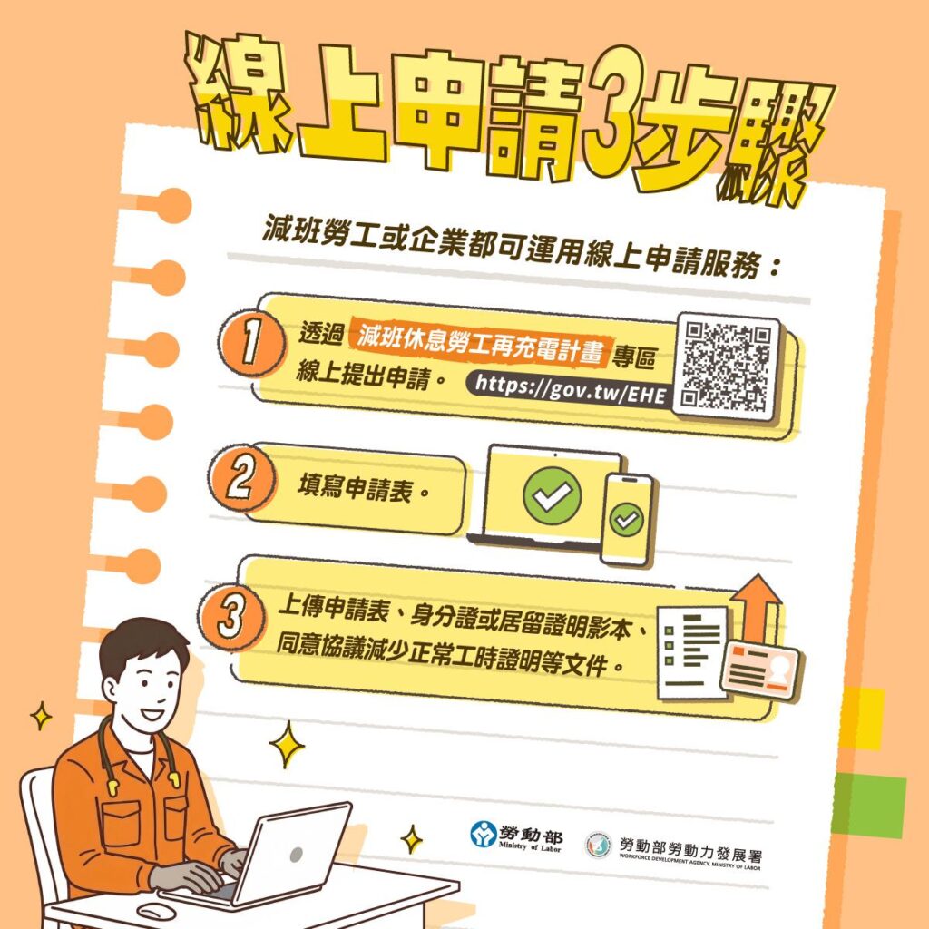 勞動力發展署提醒,企業與勞工若已達成減班休息協議,兩方都能主動向地方主管機關通報,只要檢附勞雇雙方同意減少工時的協議書,或經勞資爭議調解成立的相關紀錄,經地方主管機關查證納入通報後,即可向各分署申請參與計畫。