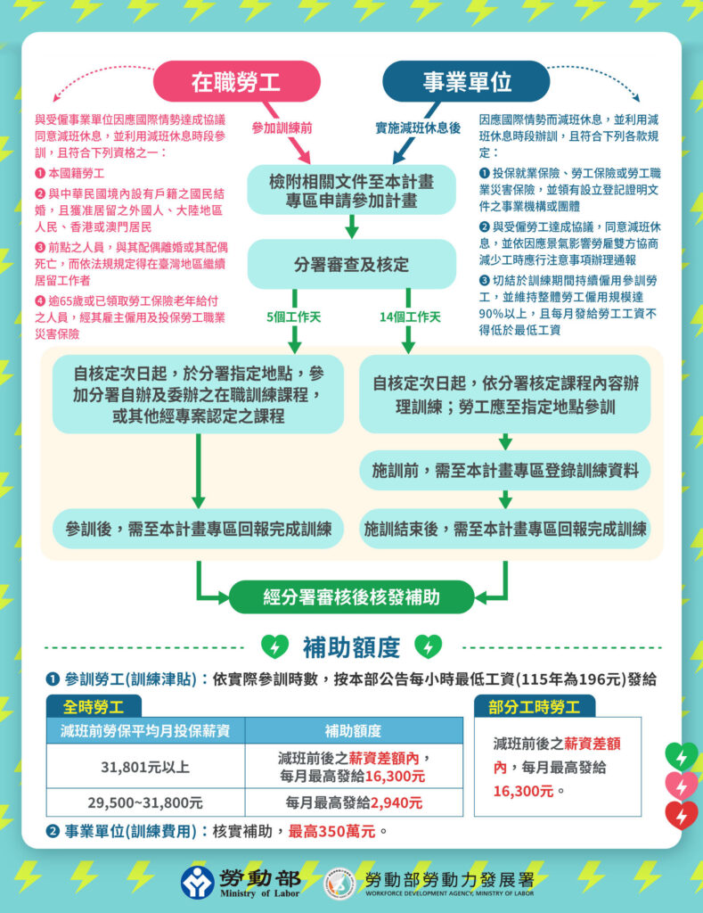 勞動力發展署表示,該計畫透過提供勞工訓練津貼及企業辦訓費用補助,鼓勵勞雇雙方善用減班休息時段投入訓練。勞工可在參訓後依時數領取津貼,企業則可藉此加強人力運用。