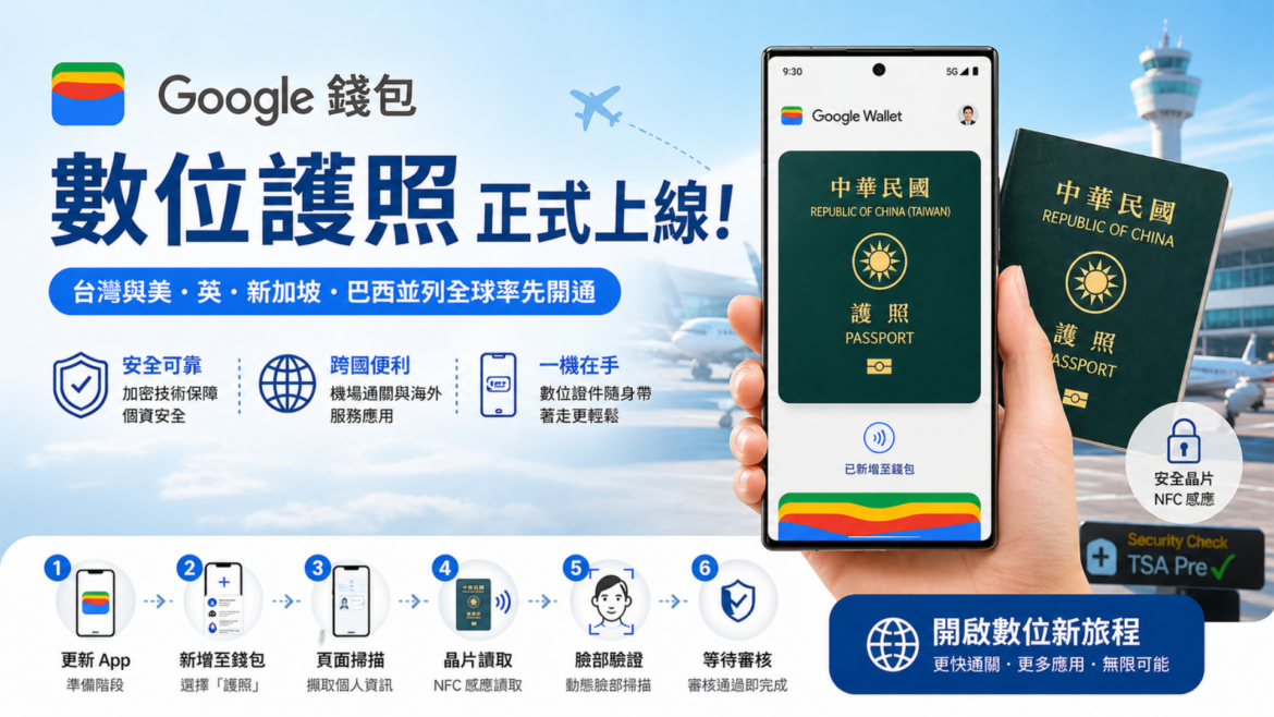 Google錢包正式開放支援將台灣護照作為數位身分證明,這項全新功能的釋出,不僅讓台灣與美國、英國、新加坡及巴西等國家並列,更使台灣成為全球少數幾波率先開通此服務的市場之一;現階段,這項數位護照功能主要應用於美國境內的機場運輸安全管理局安檢通關,同時也能用於部分支援串接的海外服務應用程式註冊,但隨著技術的普及,未來有機會擴展至更多生活情境,大幅提升跨國移動與數位驗證的便利性。