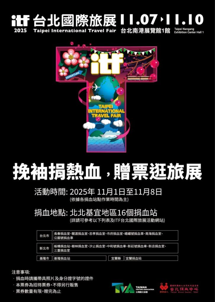 本屆ITF旅展門票預售9折優惠只到11月6日,民眾可於Klook、KKday、ibon售票系統、全家FamiPort、udn售票網、TaiTIX、OK超商OK.go購買,但響應公益可享免費逛展,主辦單位與台北捐血中心合作推出「捐血送門票」公益活動,11月1日至11月8日止,至北北基宜16個指定捐血點捐血,即可獲得門票乙張,鼓勵民眾旅遊做公益,進場把好康、優惠、旅遊靈感一次帶回家,點擊下方圖示即可確認詳細捐血資訊。