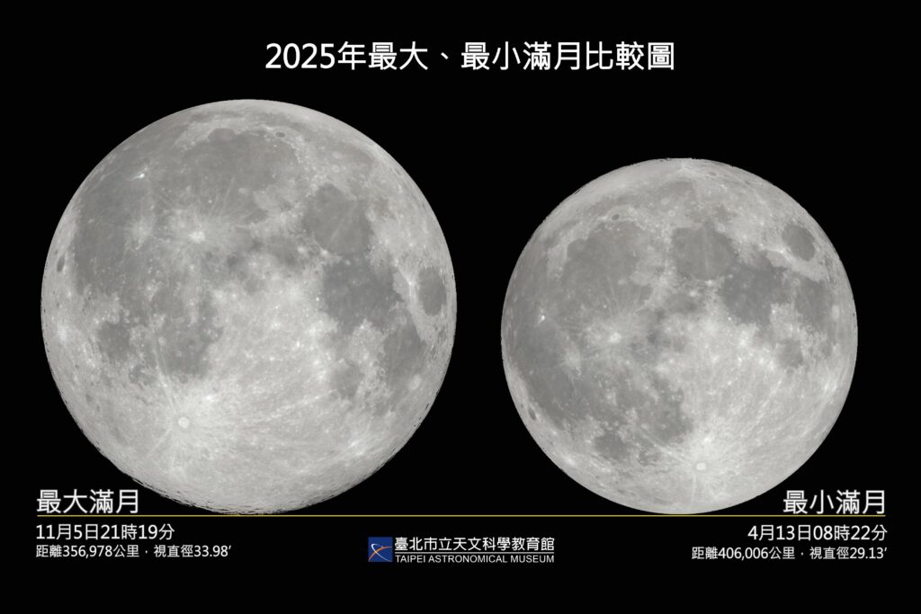 台北天文館指出,5日今年最大滿月將現身夜空,足足比4月時的最小滿月大了約六分之一,亮約三分之一,也是自2019年2月以來最大的滿月,兩者有如50元和10元硬幣大小的差異。