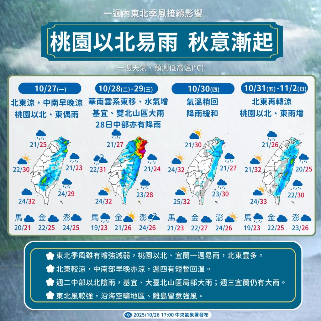 今(27日)至29日受東北季風影響,北部及東北部天氣持續偏涼且濕。尤其28、29日,由於華南雲系東移與水氣增多,迎風面的降雨範圍達到最廣。