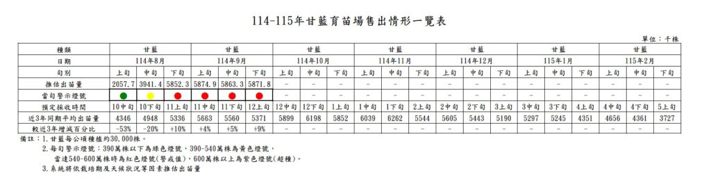 供苗預警資訊分為綠、黃、紅及紫色4種燈號,綠、黃燈代表種植面積在合理範圍內,紅燈代表農民種植面積已達合理需求上限,紫燈則代表已嚴重超量種植。