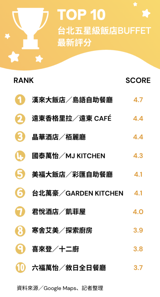 「遠東香格里拉」的「遠東Café」與「晶華酒店」的「栢麗廳」同獲4.4星評價,分別以國際料理、甜點與服務品質著稱,是企業聚餐與外商旅客的首選。