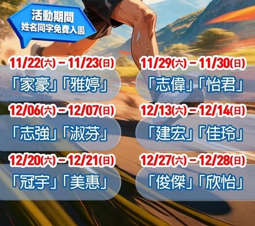 從11月22日開始至12月28日,活動期間每週六、日都有一組全台最常見姓名組合,從「家豪、雅婷」打頭陣,後續依序為「志偉、怡君」、「志強、淑芬」、「建宏、佳玲」、「冠宇、美惠」、「俊傑、欣怡」能夠享有當週免費入園資格。