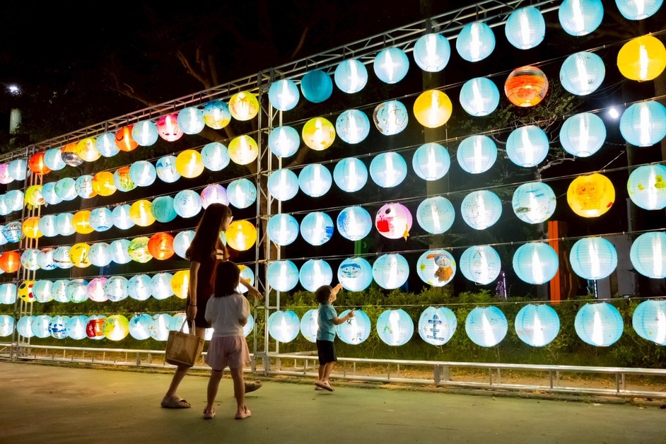 不過,今年苑裡鎮擴大規劃「市場普藝術-鎮街燈海」燈飾活動,邀請了鎮上七間幼兒園、十一處社區關懷據點,以及樂齡學習示範中心共同參與繪製,不僅在火車站前與天下路布置高空燈籠天幕,也讓燈海延伸到鎮公所前廣場、圖書館與體育場。